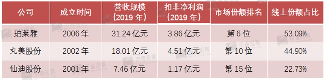 Euromonitor数据显示,2019年仙迪股份产品市场占有率在国内护肤品企业中仅排在第15位。如下图所示,珀莱雅、丸美股份成立时间均晚于仙迪股份,但目前营业收入及净利润均已经数倍于后者,仙迪股份发展明显滞后。