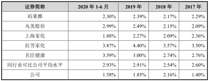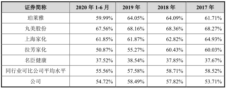 而这,进一步影响到公司的盈利能力。如下图所示,2017年-2020年上半年,仙迪股份毛利率分别为53.71%、57.82%、58.49%和 54.72%,明显低于珀莱雅、丸美股份及上海家化等同行可比上市公司同期毛利率水平,甚至低于主营日化产品的拉芳家化(603630,股吧)。