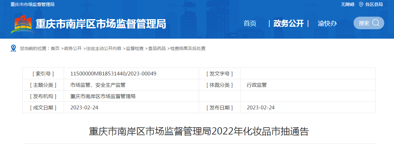 | 1 | 2022/4/7 | Sc22500801 | 经营环节 | / | / | / | / | / | / | / | 重庆慕斯娅美容美发有限公司 | 重庆市南岸区南坪街道江南大道28号自编号H2-07号 | 直辖市 | 黎宏 | 李力 | 91500108MA60PY3B60 | 美容美发机构 | 染发类 | 发彩护理染发膏(褪浅膏) | DJ1213LG | 2021年10月1日 | 2024.10.12 | 2024.10.12 | 3支 | 90g/支 | 国妆特字G20212671 | 12元 | 36元 | 常温 | 否 | 广东 | 20 | 广州发彩化妆品有限公司 | 广州市白云区景泰西八巷41号1-5层(部位:自编号2号楼4楼B403) | 粤妆20160693 | / | / | / | 重庆市南岸区市场监督管局 | 重庆市南岸区金紫街175号 | 400060 | 颜波 | / | 合格 |