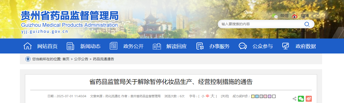 贵州九立德生物制药有限公司在我局组织的日常检查中,因不符合化妆品生产质量管理规范要求,被我局采取暂停生产、经营的风险控制措施。企业在完成缺陷项目的整改后,向我局提出解除风险控制措施的申请,经现场检查,确认企业已完成整改。依据《化妆品监督管理条例》第五十四条和国家药监局《关于发布<化妆品生产质量管理规范检查要点及判定原则>的公告》(2022年第90号)的规定,解除对该企业暂停生产、经营的风险控制措施。