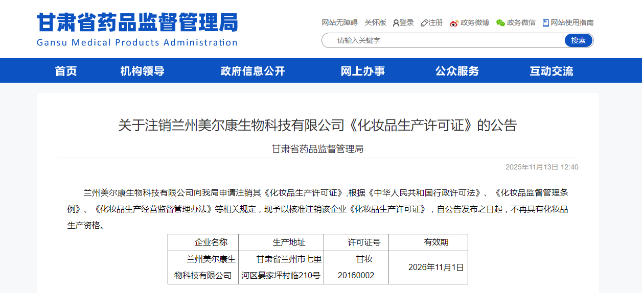 兰州美尔康生物科技有限公司向我局申请注销其《化妆品生产许可证》,根据《中华人民共和国行政许可法》、《化妆品监督管理条例》、《化妆品生产经营监督管理办法》等相关规定,现予以核准注销该企业《化妆品生产许可证》,自公告发布之日起,不再具有化妆品生产资格。