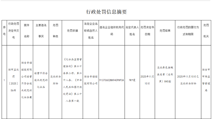 烟台奇诺控股有限公司因经营不符合技术规范的化妆品,烟台市市场监督管理局依据《化妆品监督管理条例》第六十条第二项、第六十八条、《中华人民共和国行政处罚法》第二十八条第一款对其做出烟市监处罚〔2025〕56号处罚决定,没收秀色独艳染发膏(自然黑)840盒。