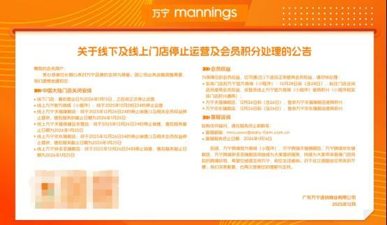 中国内地长期以来都是各行业品牌角逐的核心战场,化妆品行业也不例外。然而就在12月16日,市场却传来一则意外消息——药妆连锁店万宁mannings突然官宣:线下门店于2026年1月15日终止运营;线上官方商城(小程序)将于12月28日24时停运,天猫、京东、拼多多等旗舰店则于12月26日24时停止销售,售后服务均延续至2026年1月25日。