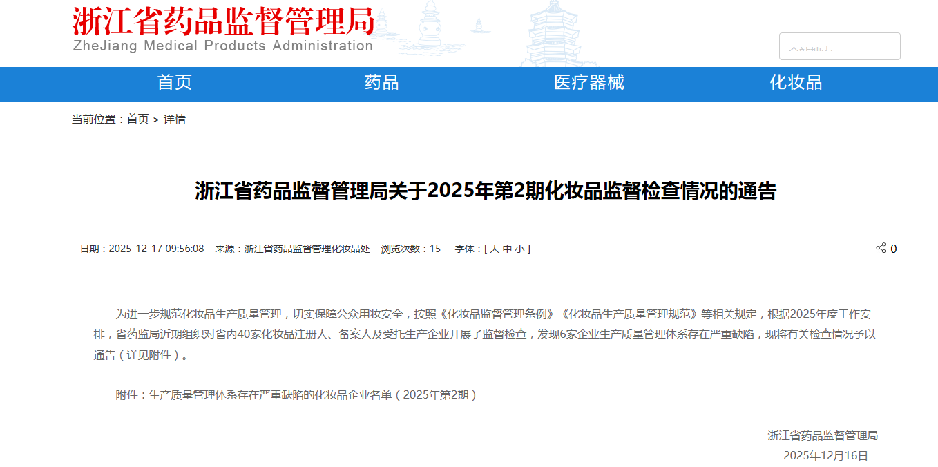 为进一步规范化妆品生产质量管理,切实保障公众用妆安全,按照《化妆品监督管理条例》《化妆品生产质量管理规范》等相关规定,根据2025年度工作安排,省药监局近期组织对省内40家化妆品注册人、备案人及受托生产企业开展了监督检查,发现6家企业生产质量管理体系存在严重缺陷,现将有关检查情况予以通告(详见附件)。